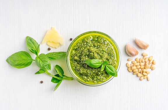 This is a slightly cheesier version of the standard pesto, so adjust the amount of cheese if desired. Try any combination of herbs or nuts in this recipe.