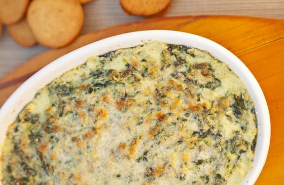 A bit of a twist on the standard spinach artichoke dip, for the more grown-up palate. The combination of Gruyère and Parmesan gives the dip a pleasant nuttiness. No special pan required – we found that using a pie plate was the best and quickest way to warm this dish.