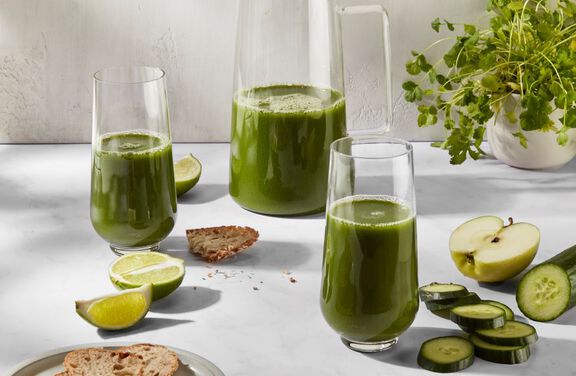 The ginger and lime brighten up this green-packed juice. We like to keep lime juice on hand to add to water or juices, but if you prefer, you can put in one-fourth of a peeled lime while juicing.